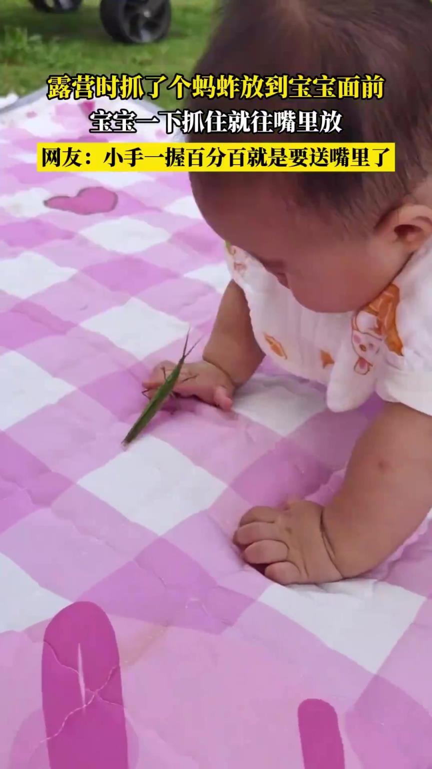露营时抓了个蚂蚱放到宝宝面前,宝宝一下抓住就往嘴里放