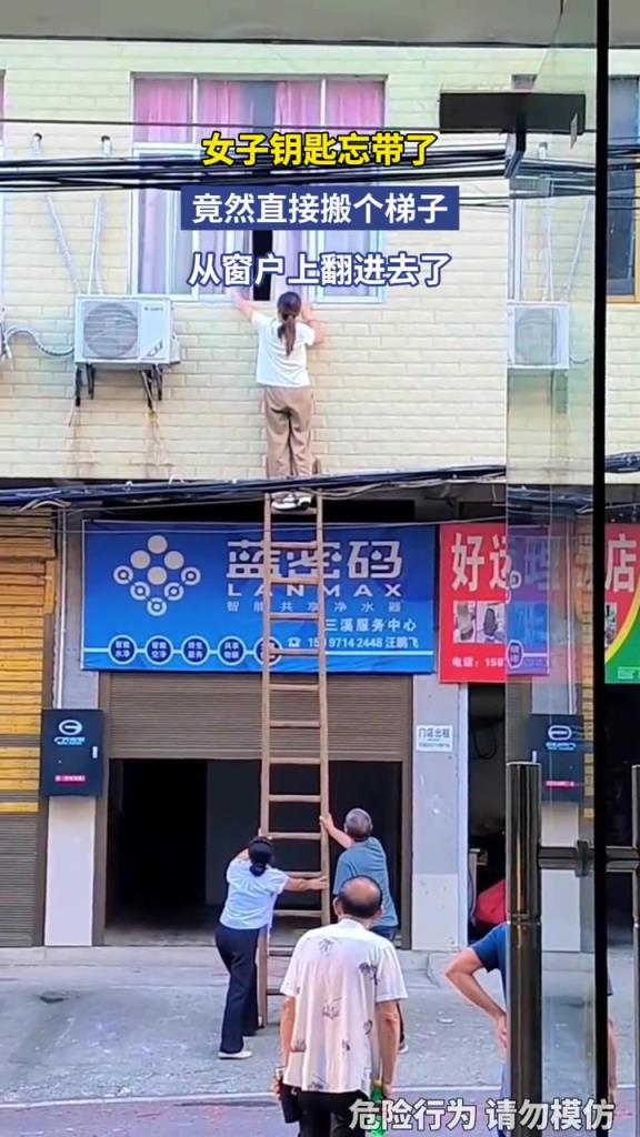 女子钥匙忘带了,竟然直接搬个梯子,从窗户上翻进去了!