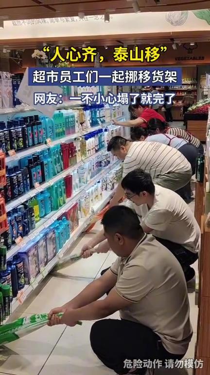 “人心齐,泰山移”,超市员工们一起挪移货架