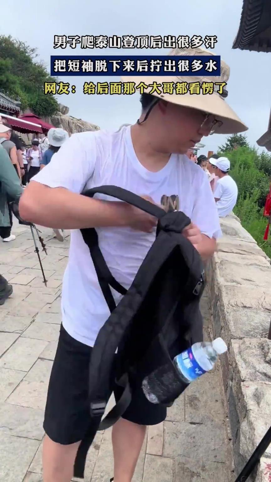 男子爬泰山登顶后出很多汗,把短袖脱下来后拧出很多水