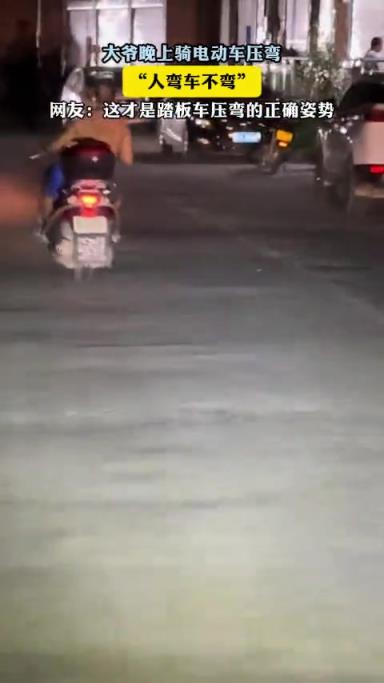 大爷晚上骑电动车压弯, 人弯车不弯!!