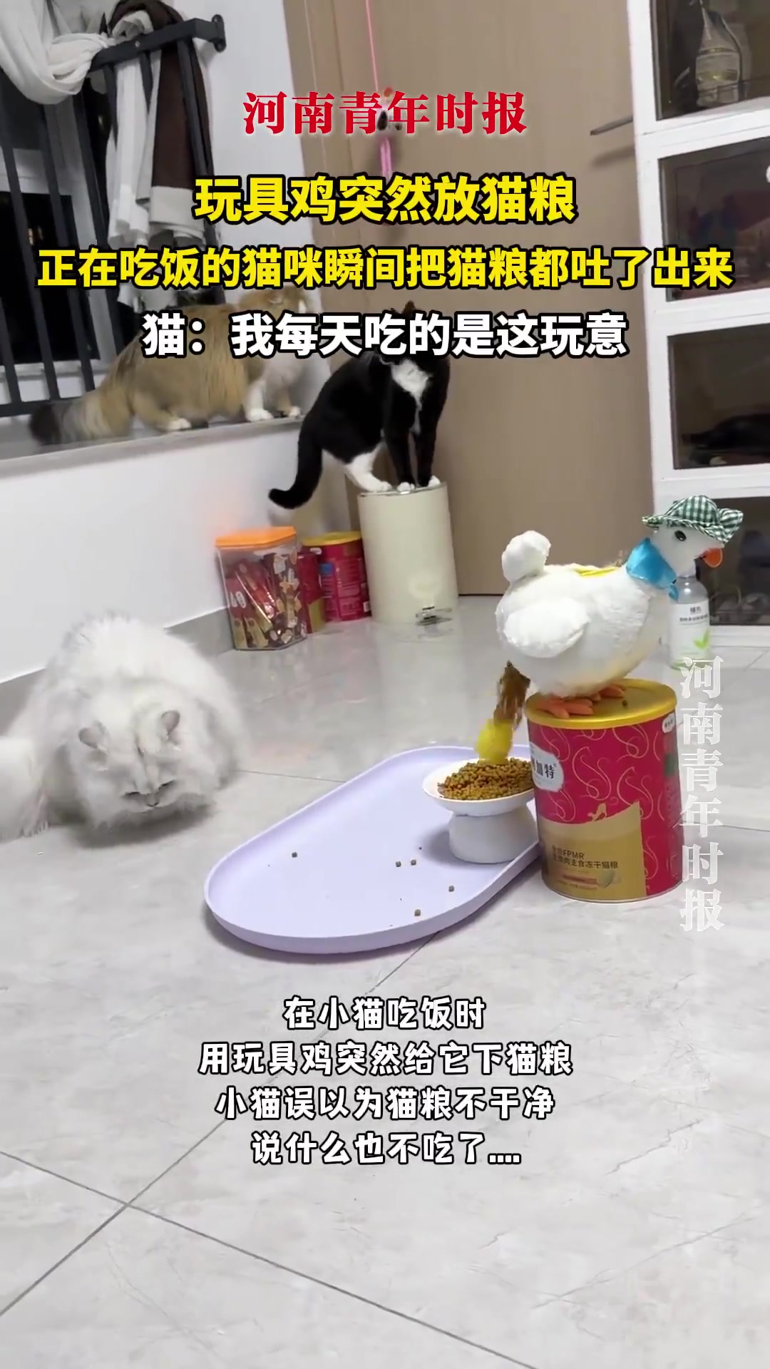 玩具鸡突然“拉”猫粮,正在吃饭的猫咪瞬间把猫粮都吐了出来