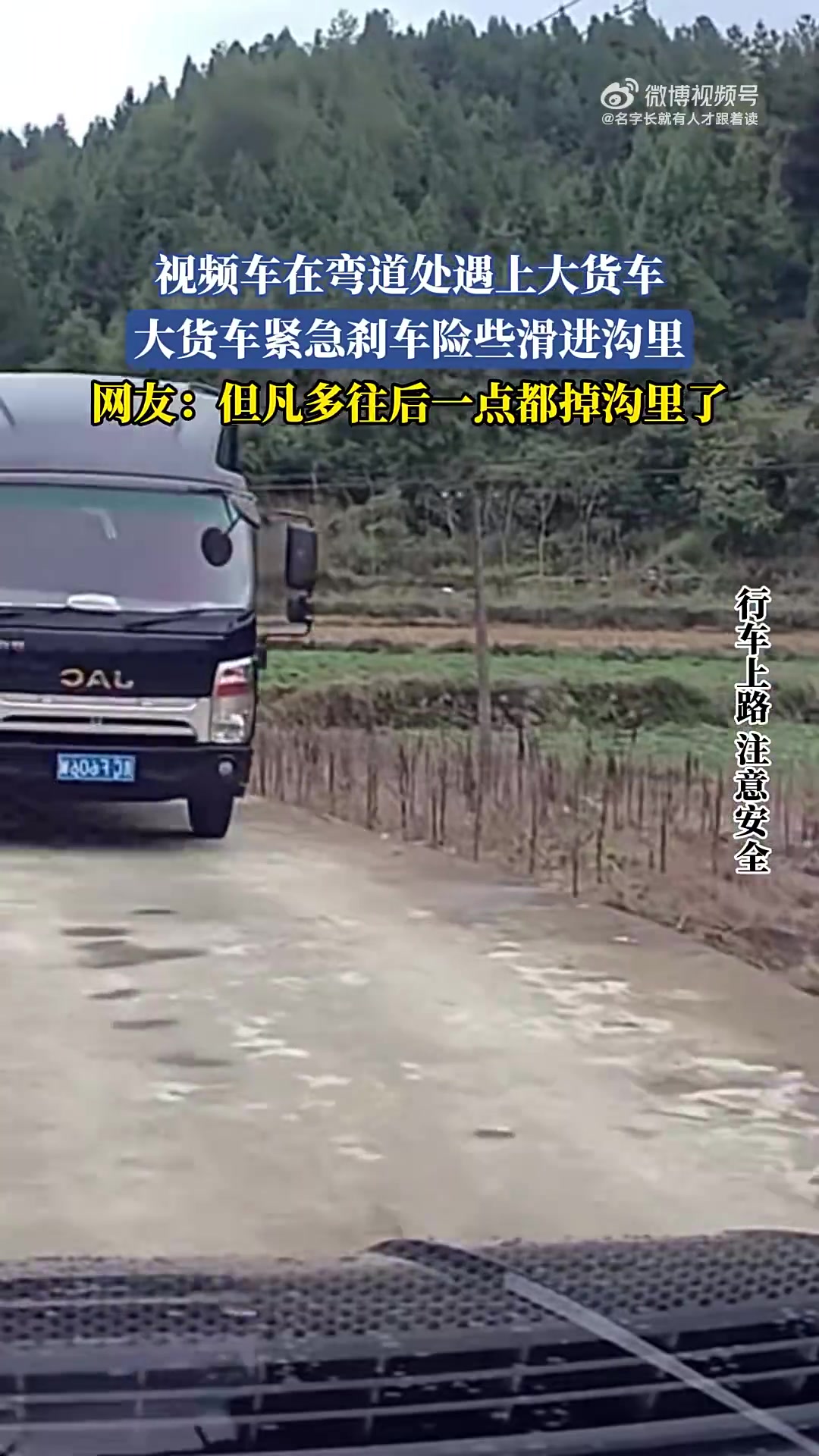 视频车在弯道处遇上大货车,大货车紧急刹车险些滑进沟里