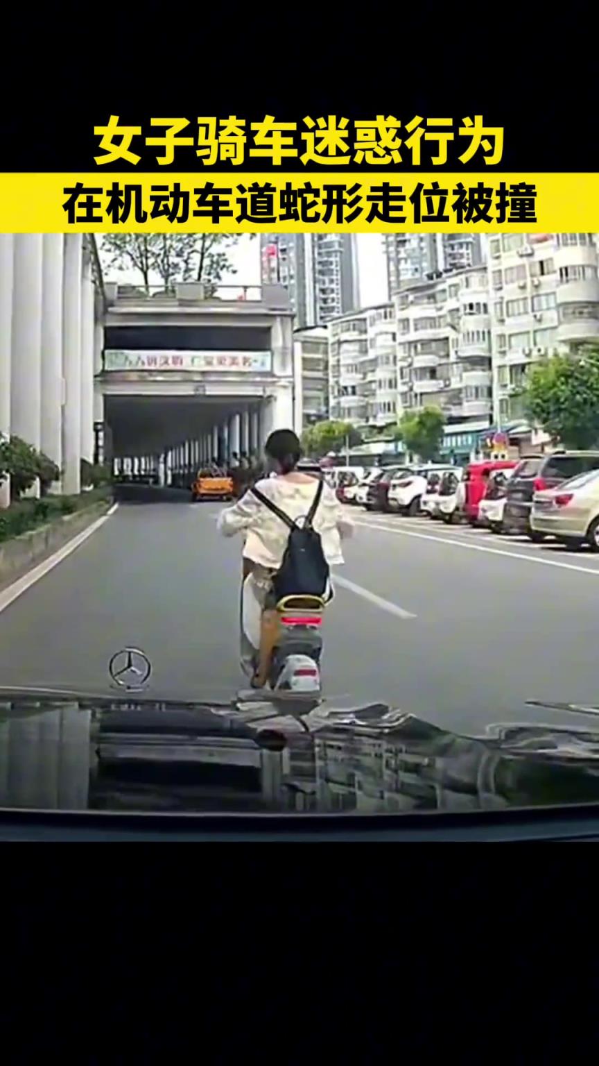 女子骑车迷惑行为 在机动车道蛇形走位被撞