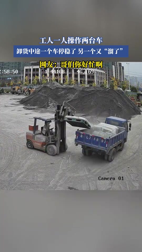 工人一人操作两台车,卸货中途一个车停稳了 另一个又“溜了”