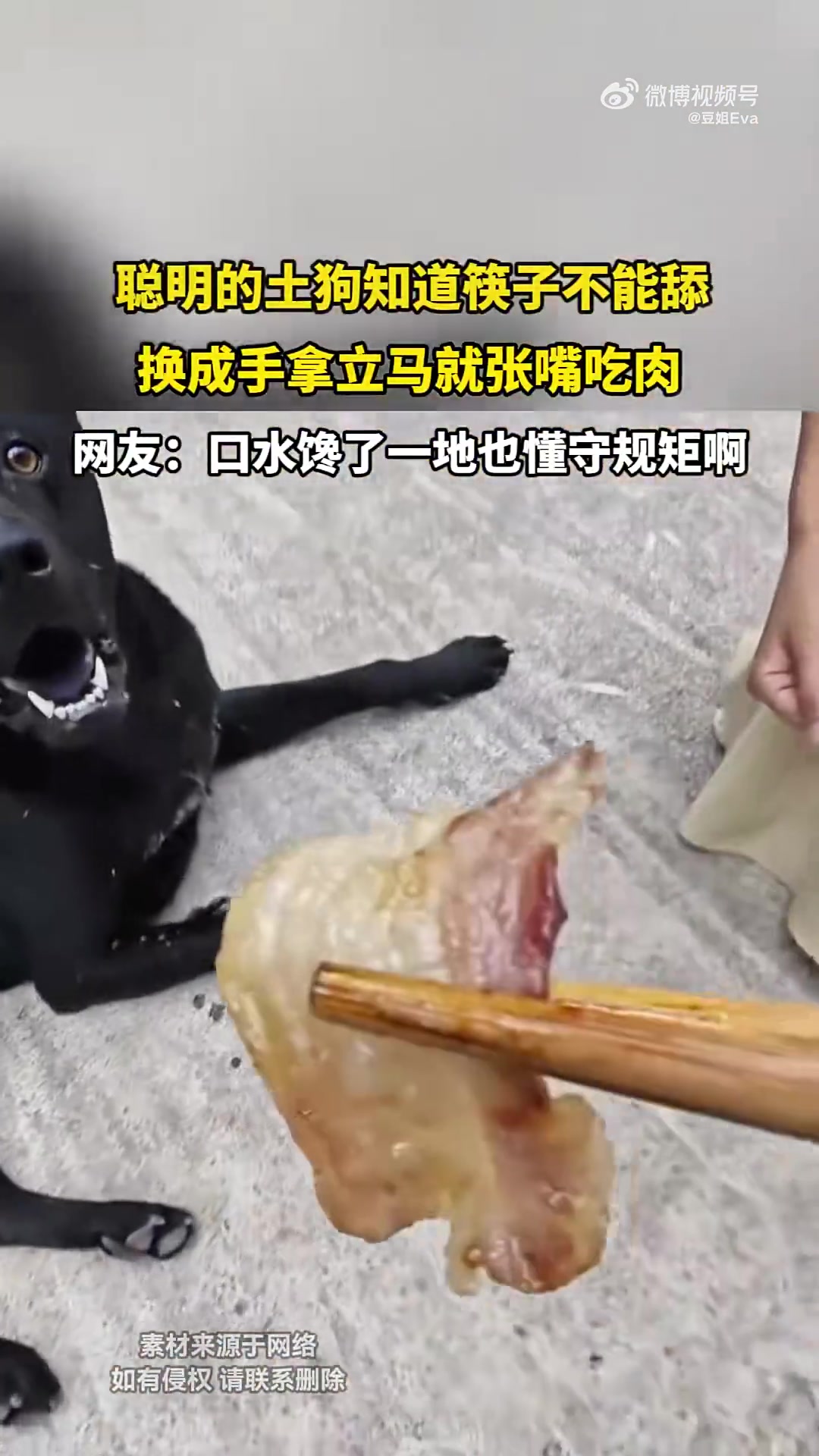 聪明土狗:筷子食物不舔,手拿就张嘴吃肉