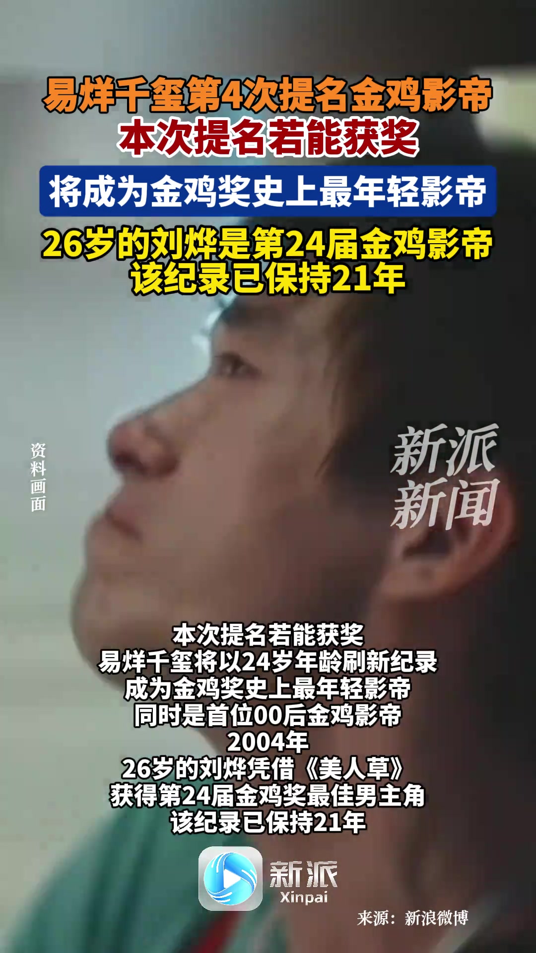 易烊千玺第4次提名金鸡影帝 若能获奖将成为金鸡奖史上最年轻影帝