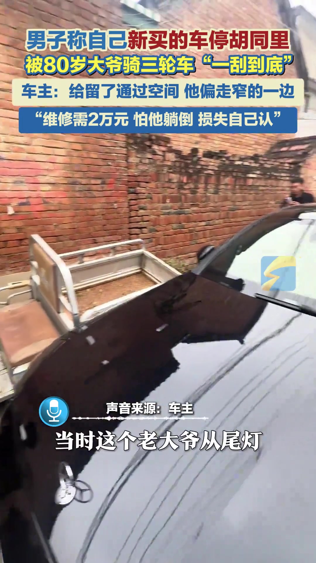 男子称自己新买的车停胡同里,被80岁大爷骑三轮车“一刮到底”