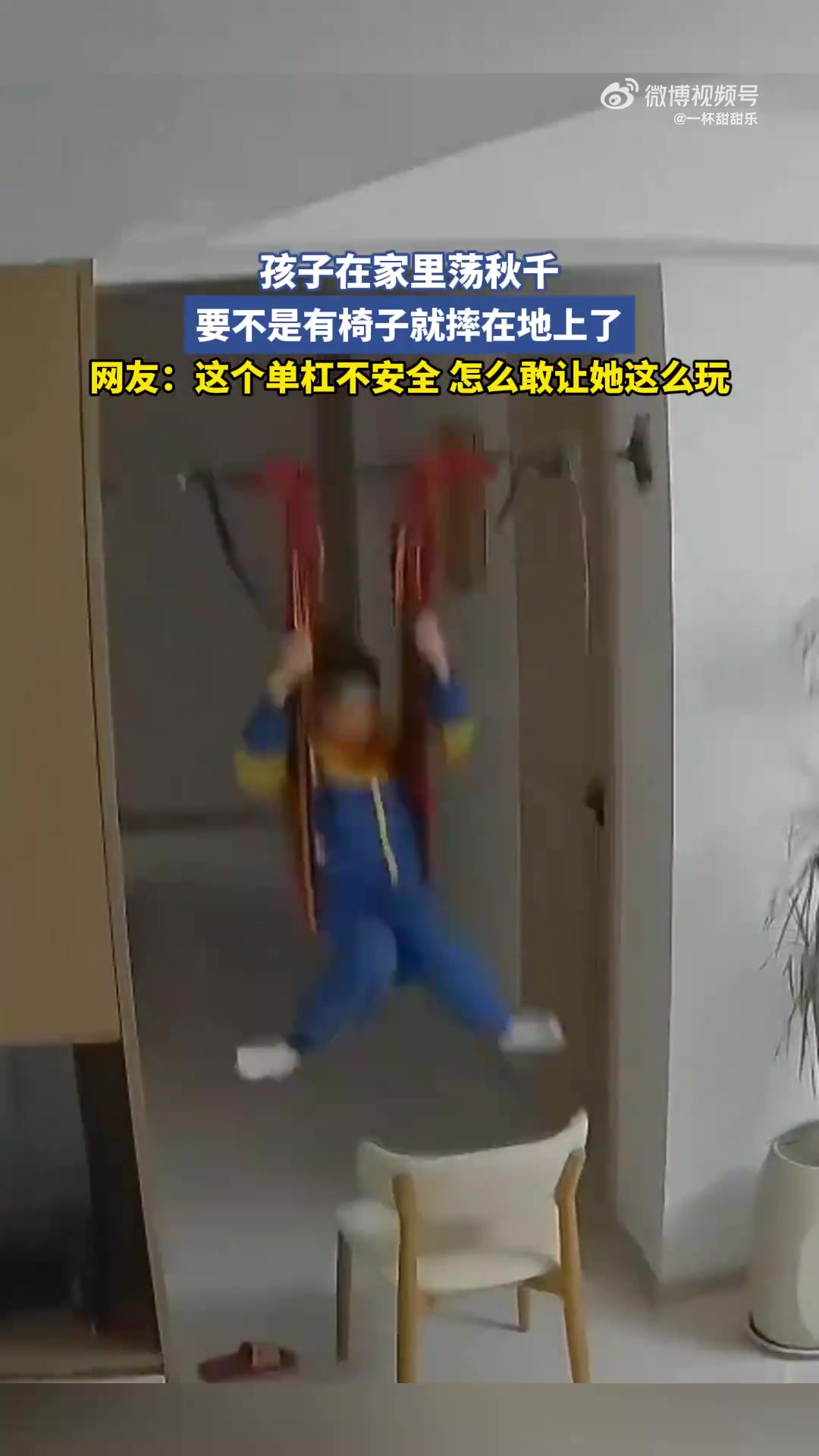 孩子在家里荡秋千,要不是有椅子就摔在地上了
