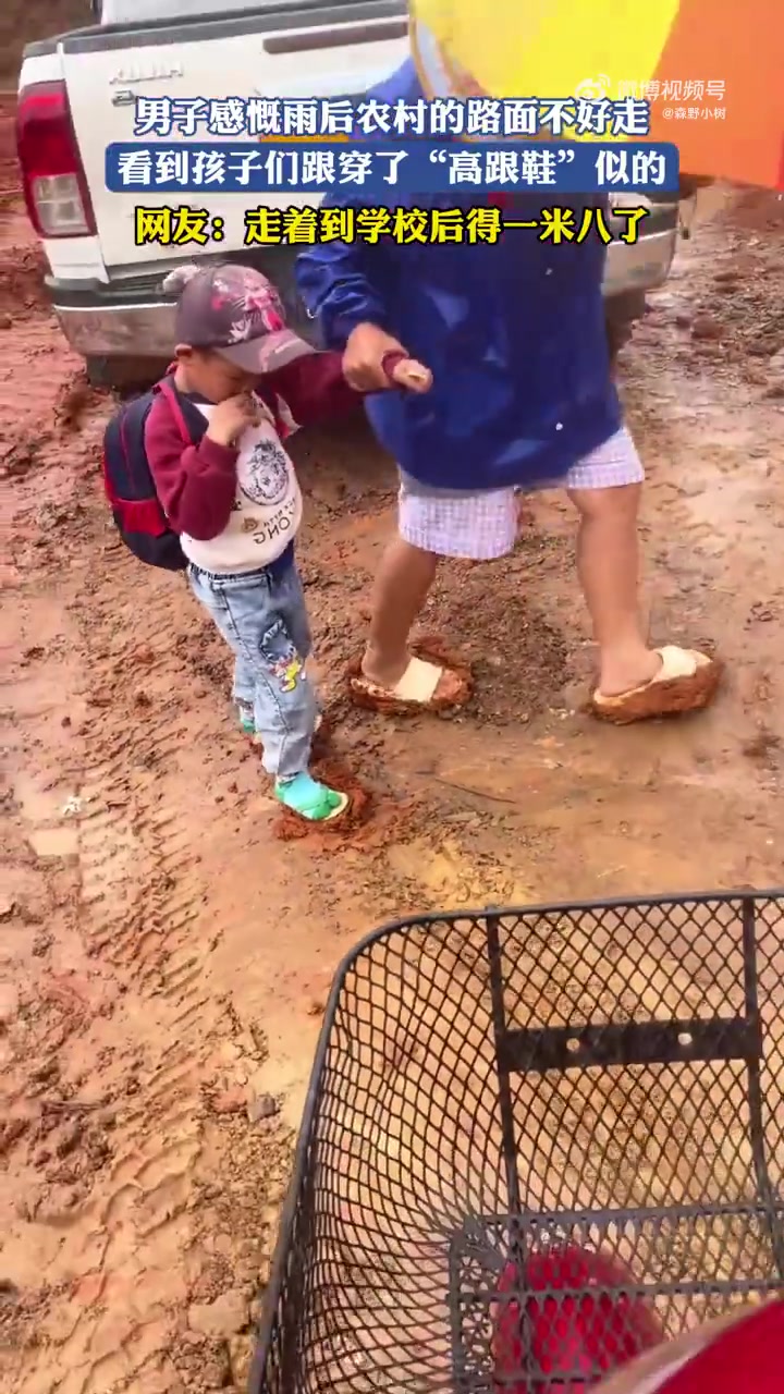 男子感慨雨后农村的路面不好走,看到孩子们跟穿了“高跟鞋”似的