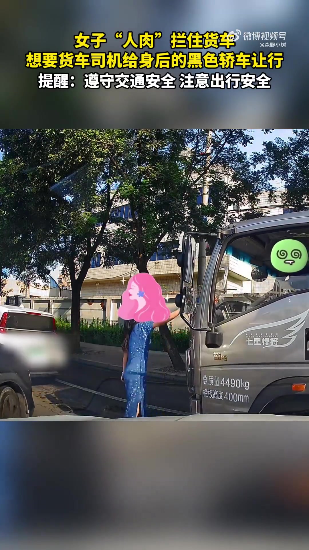 女子“人肉”拦住货车,想要货车司机给身后的黑色轿车让路