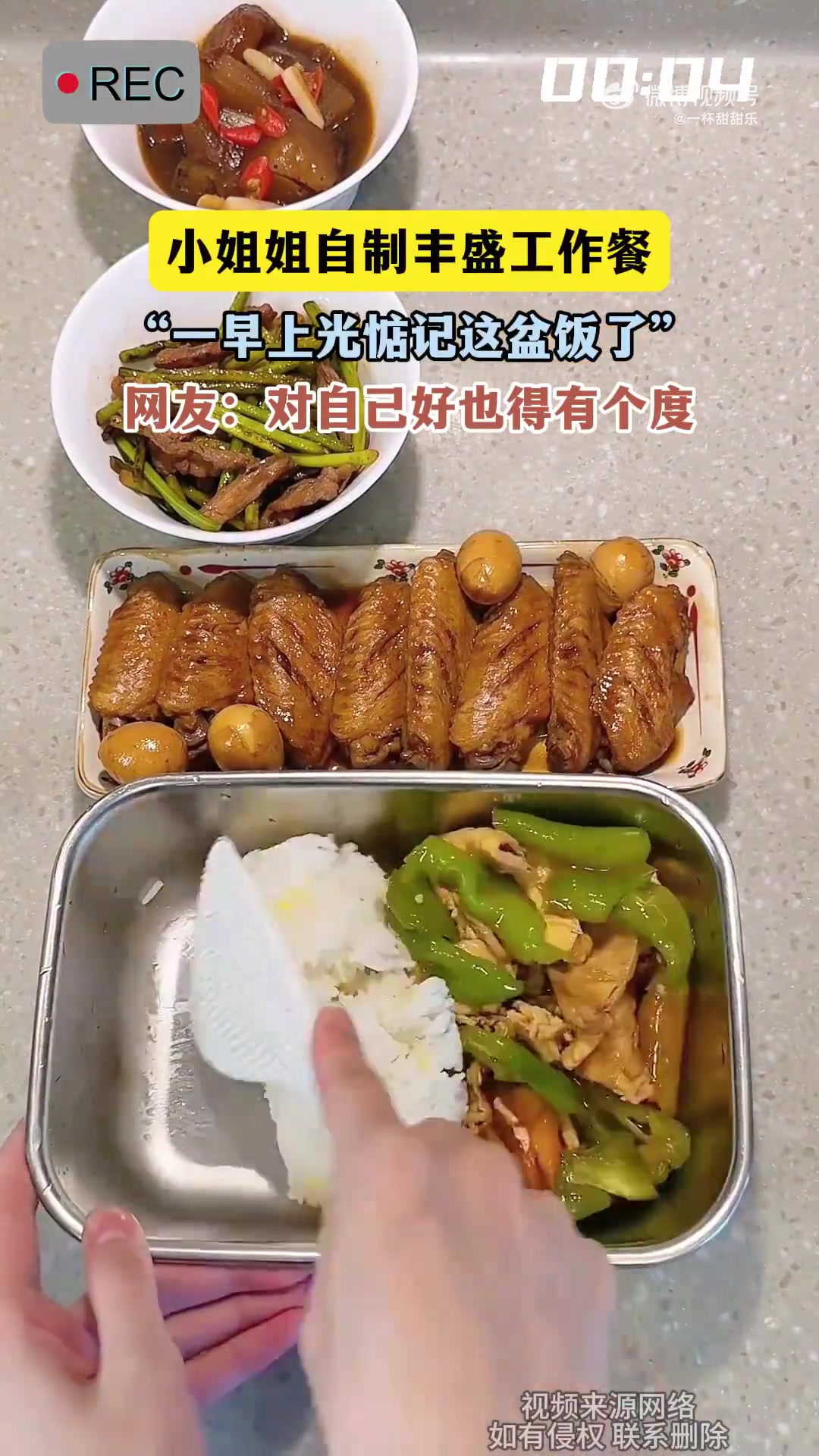 小姐姐自制丰盛工作餐,“一早上光惦记这盆饭了”