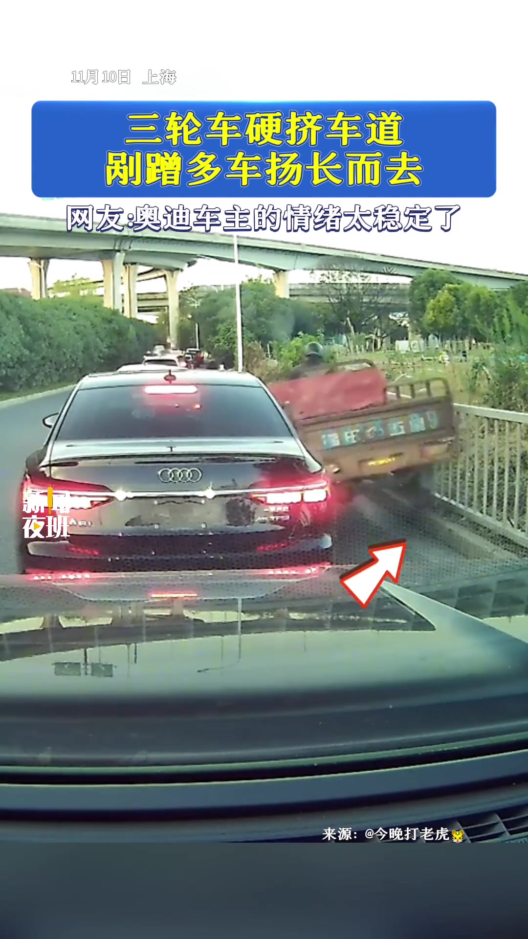 三轮车硬挤车道,剐蹭多车扬长而去...