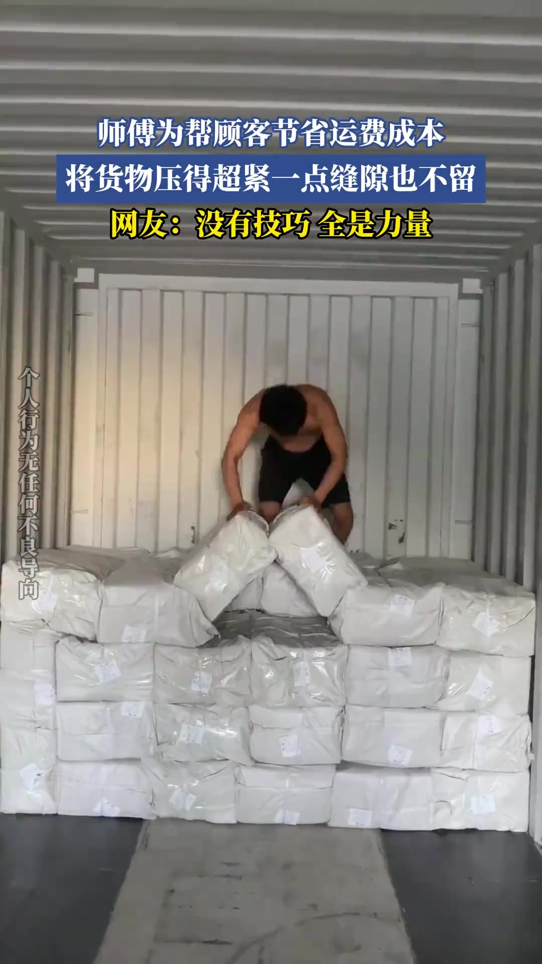 师傅为帮顾客节省运费成本,将货物压得超紧,一点缝隙也不留