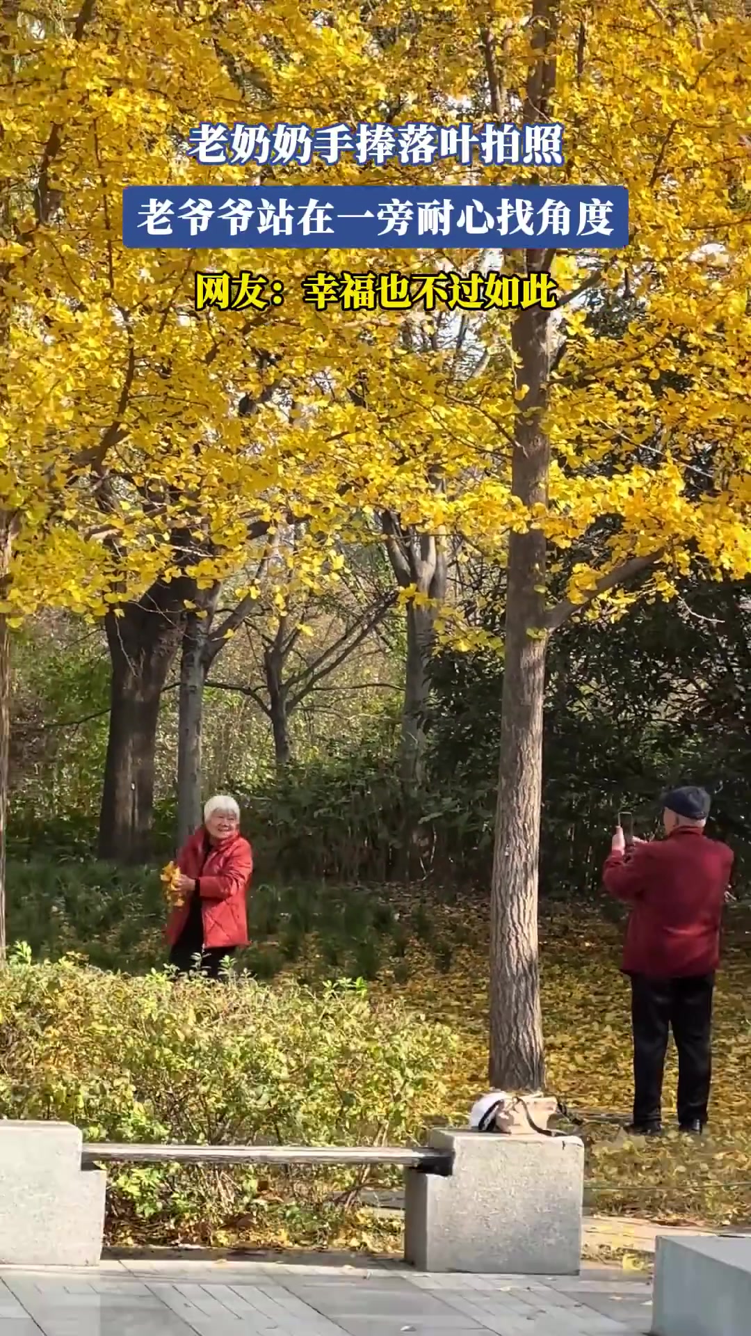 老奶奶手捧落叶拍照,老爷爷站在一旁耐心找角度