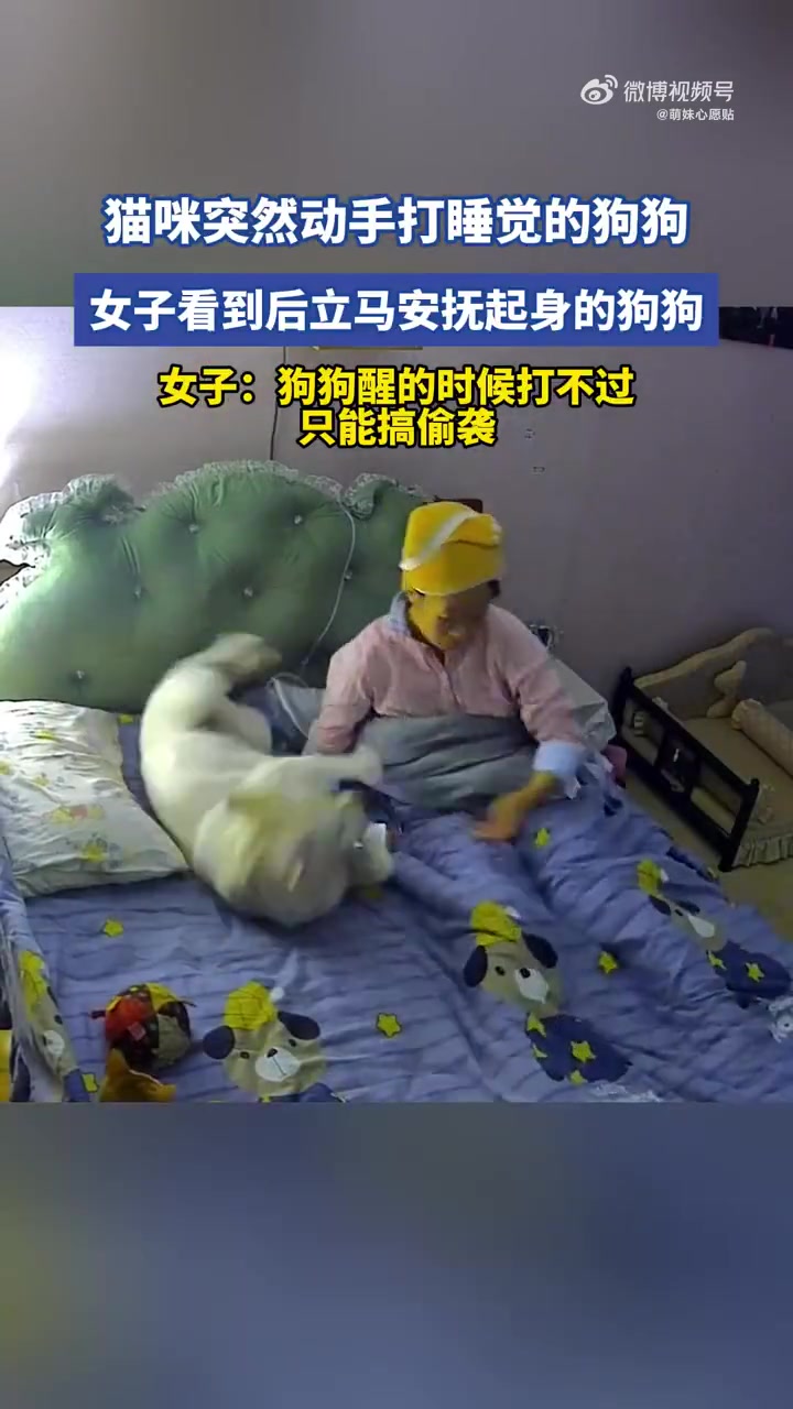 猫咪突然动手打睡觉的狗狗,女子看到后立马安抚起身的狗狗!