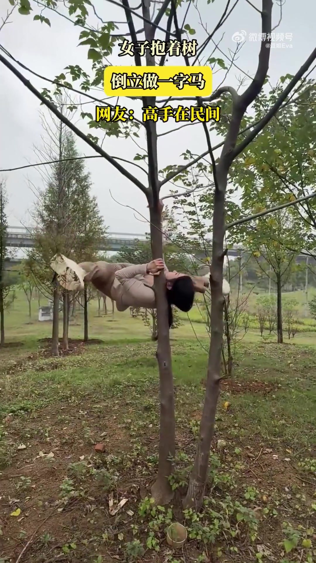 女子抱着树,倒立做一字马,网友:高手在民间 !