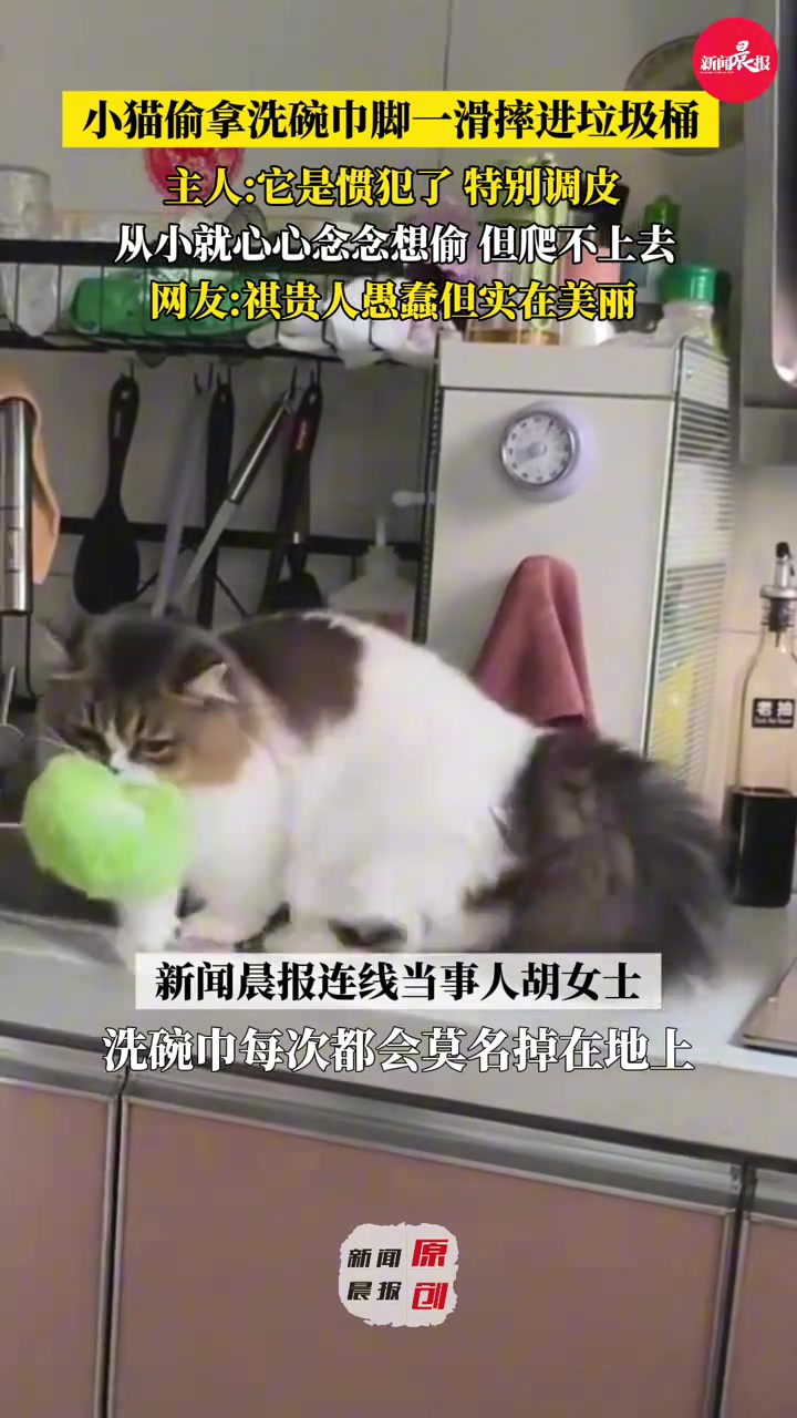 小猫偷拿洗碗巾脚一滑摔进垃圾桶