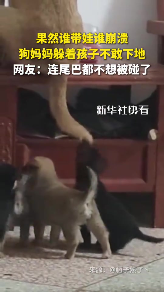 果然谁带娃谁崩溃,狗妈妈躲着孩子不敢下地,连尾巴都不想被碰了