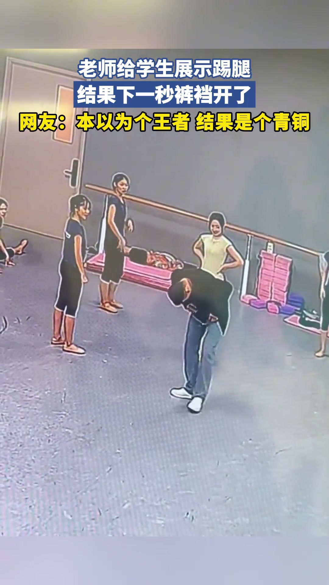 老师给学生展示踢腿,结果下一秒裤裆开了
