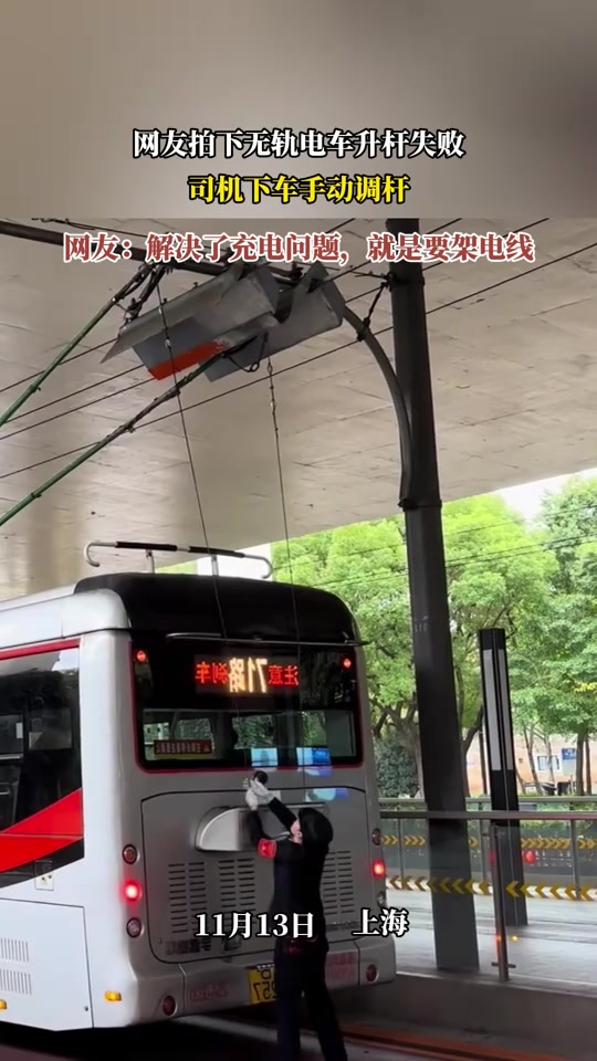 网友拍下无轨电车升杆失败,司机下车手动调杆