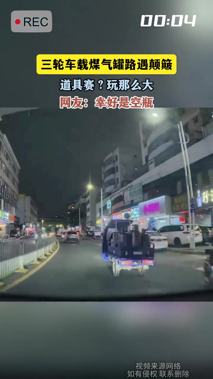 三轮车载煤气罐路遇颠簸,道具赛?玩那么大!