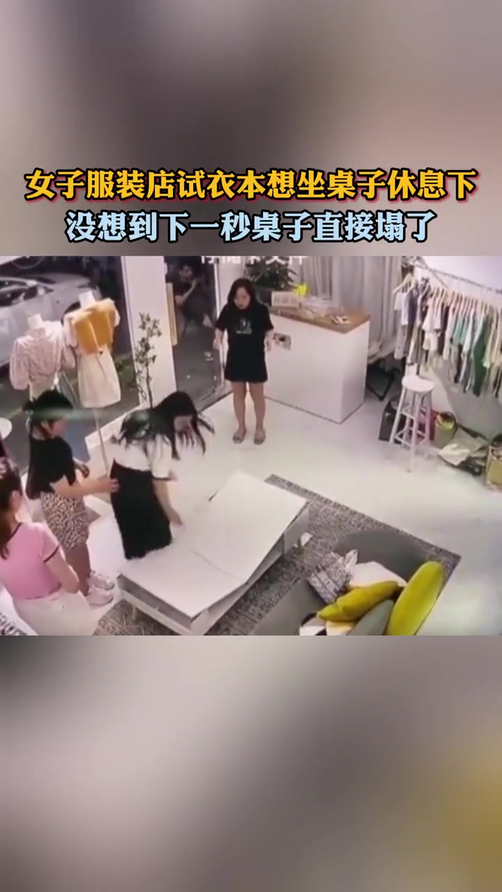 女子服装店试衣本想坐桌子休息下,没想到下一秒桌子直接塌了!