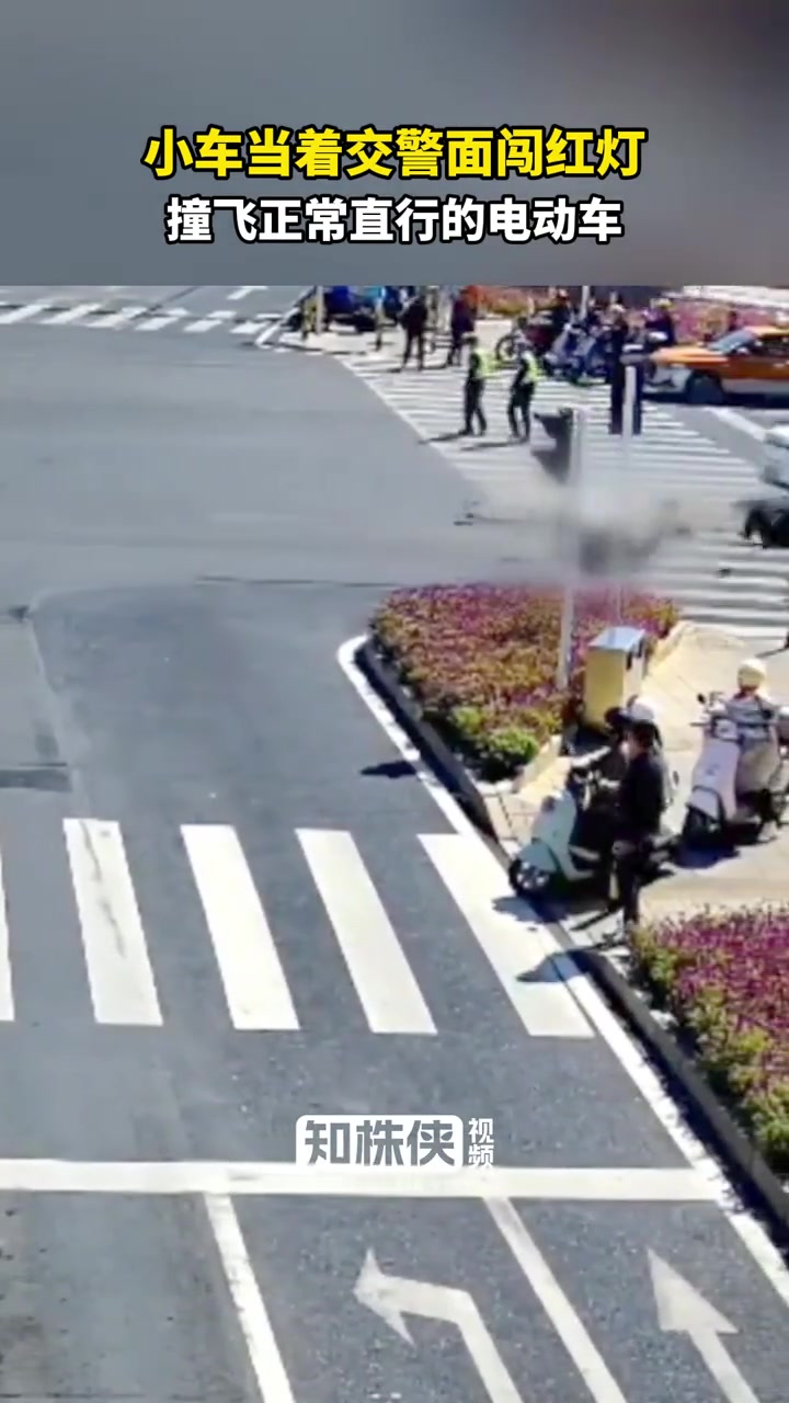 小车当着交警面闯红灯 撞飞正常直行的电动车
