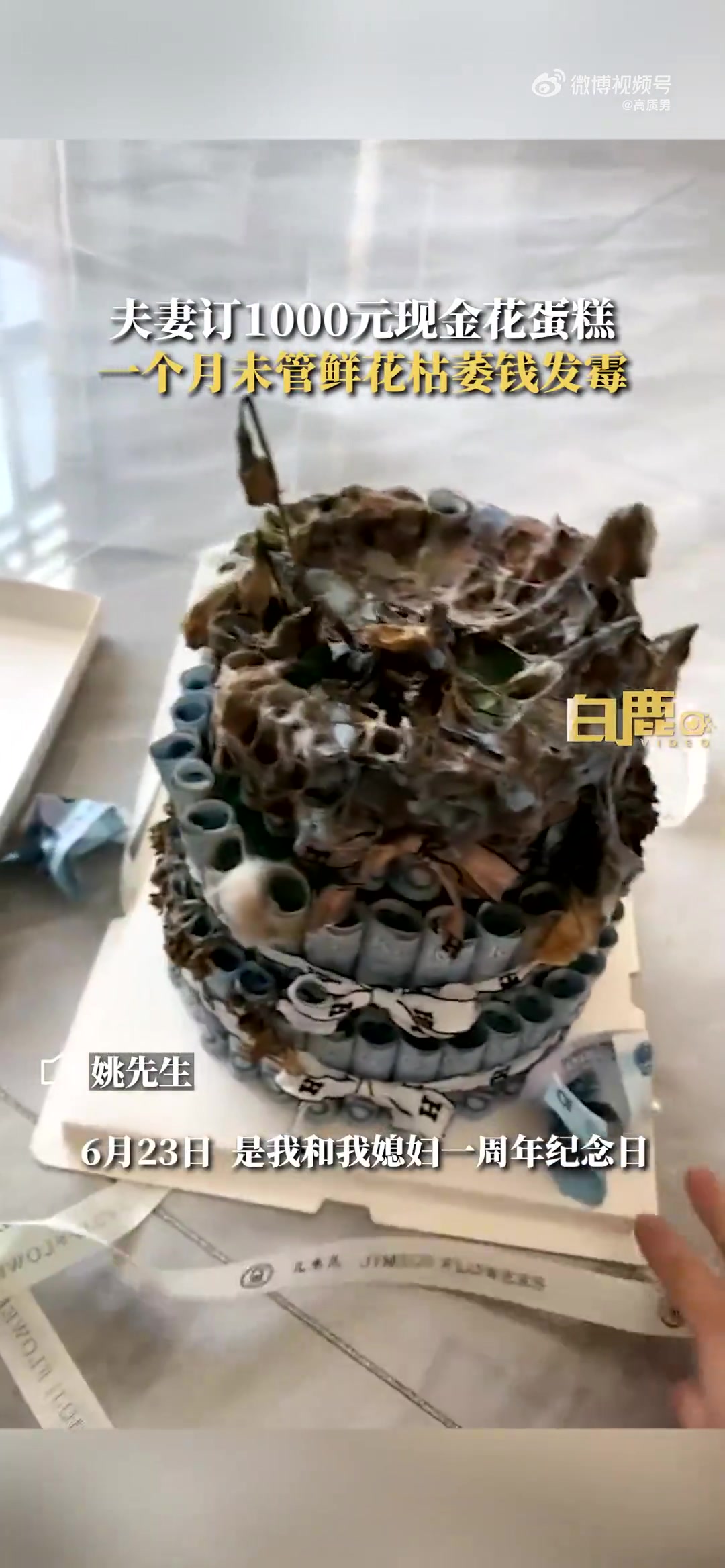 夫妻订1000元现金花蛋糕,一个月未管鲜花枯萎钱发霉。