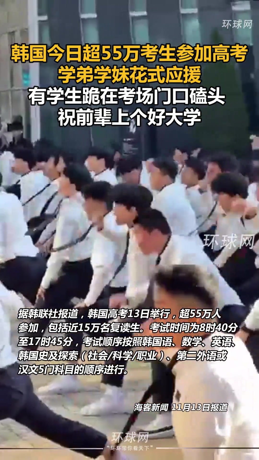 韩国高考,有学生跪在考场门口磕头,祝前辈上个好大学