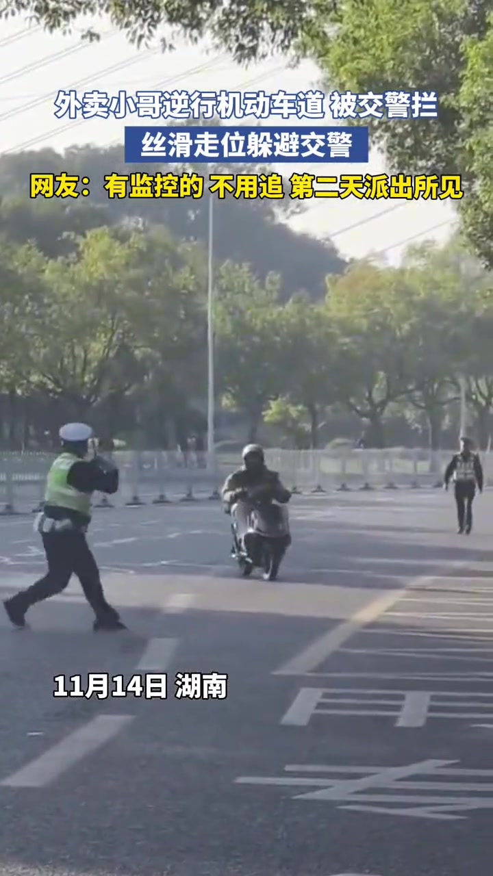 外卖小哥逆行机动车道,被交警拦,丝滑走位躲避交警!!