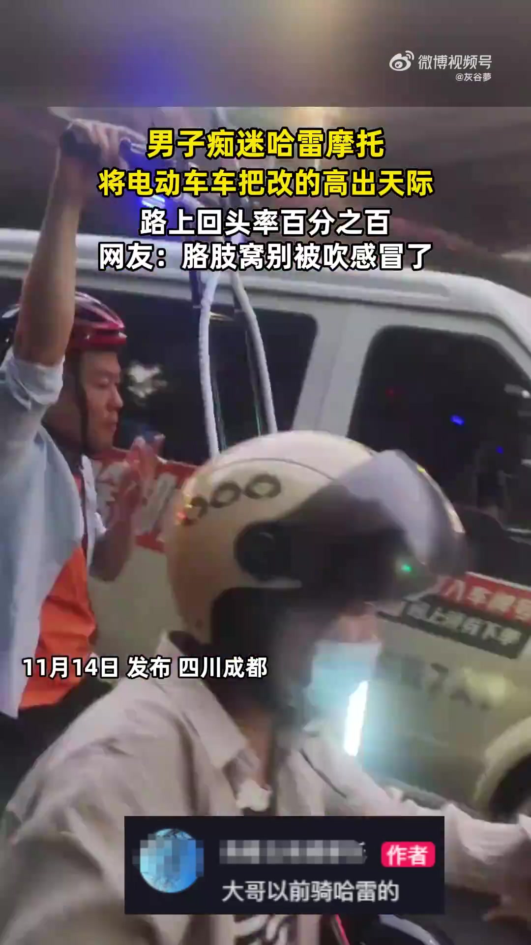 男子痴迷哈雷摩托,将电动车车把改得高出天际!!!