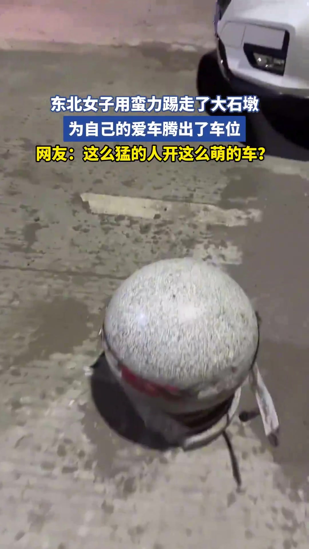 东北女子用蛮力踢走了大石墩,为自己的爱车腾出了车位