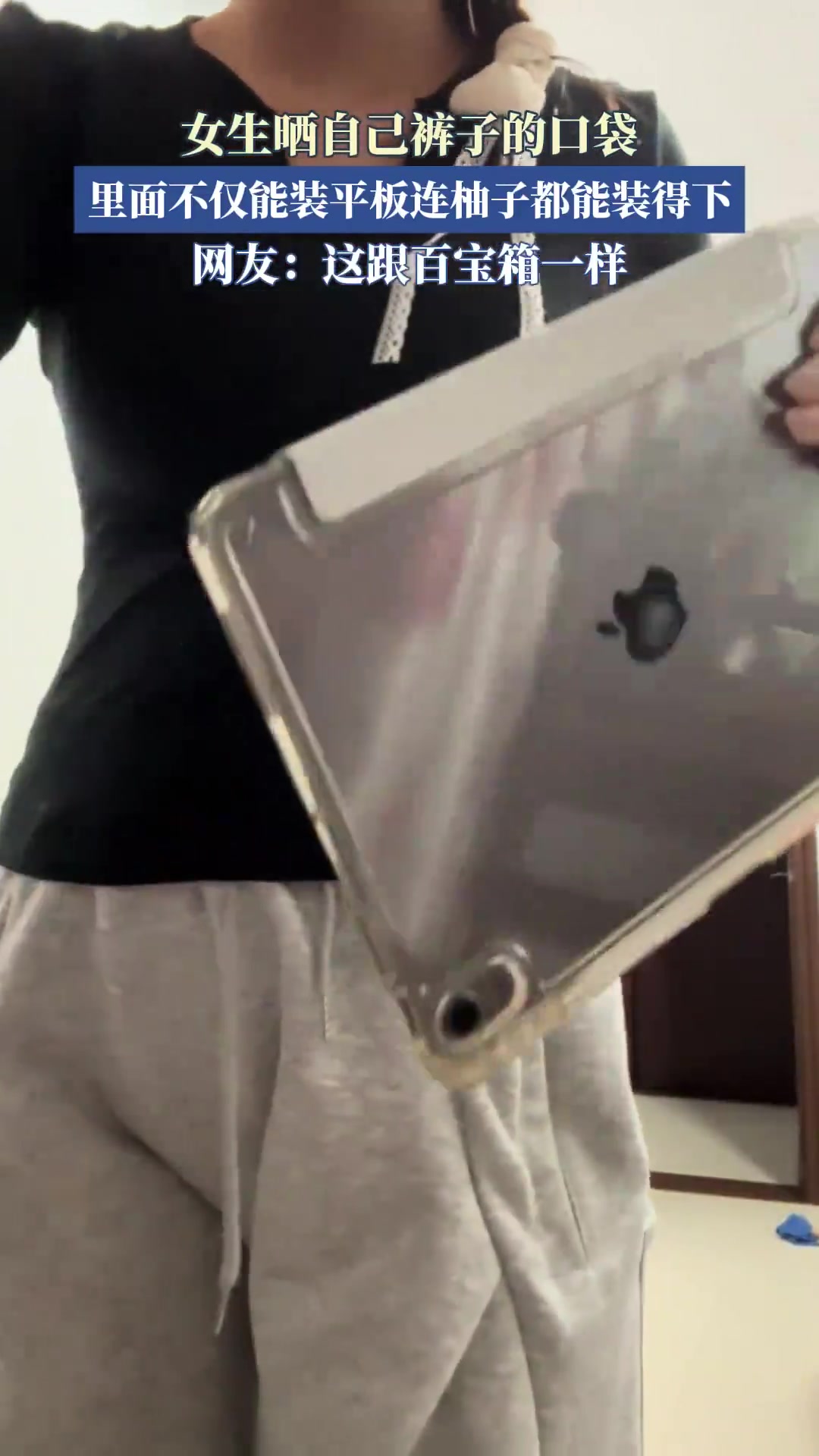 女生晒自己裤子的口袋,里面不仅能装平板连柚子都能装得下