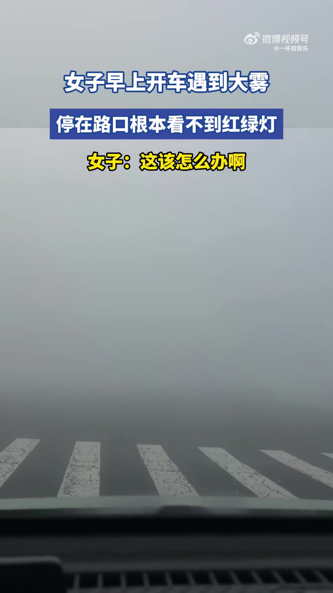 女子早上开车遇到大雾,停在路口根本看不到红绿灯