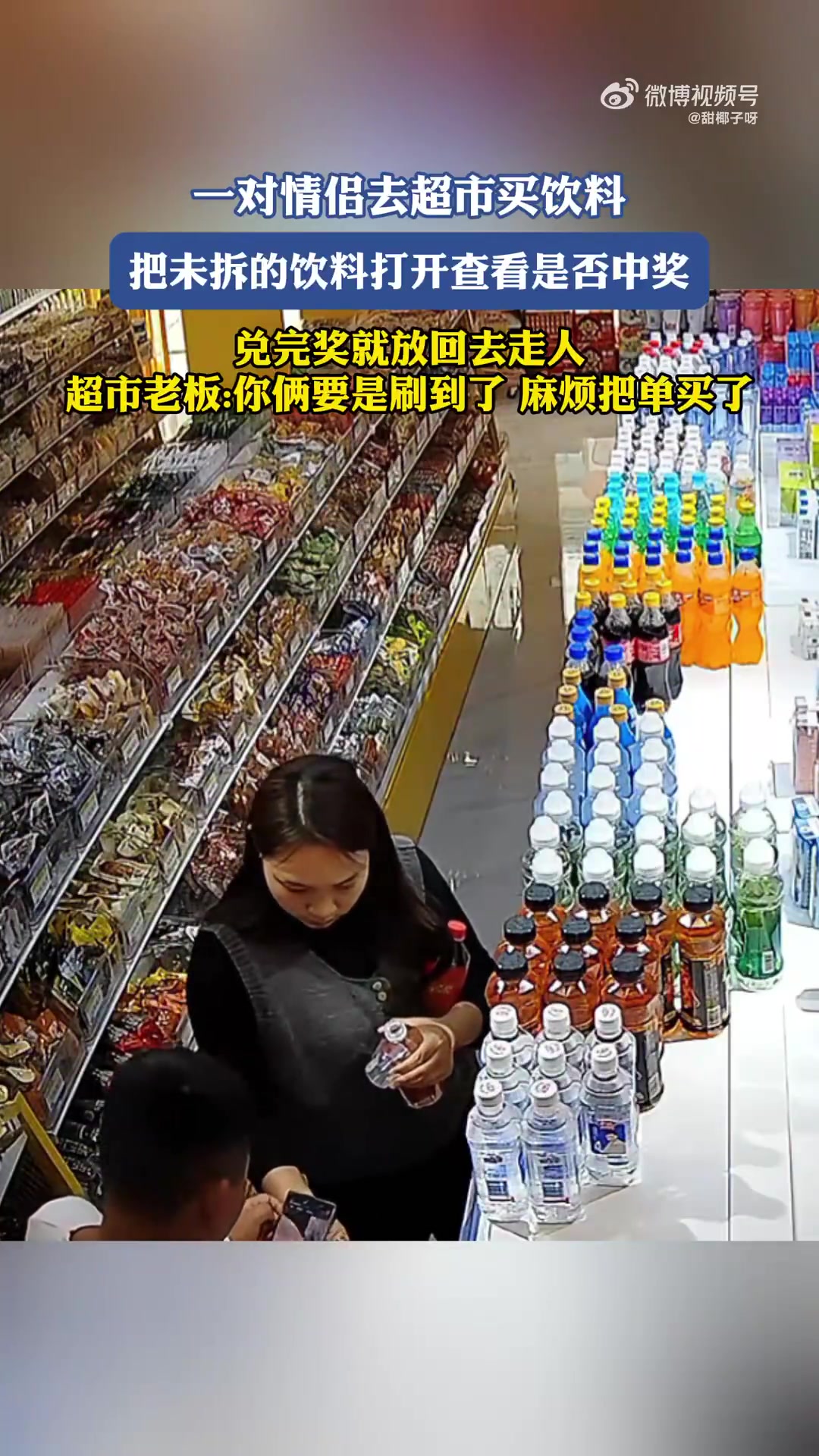 一对情侣去超市买饮料,把未拆的饮料打开查看是否中奖!!