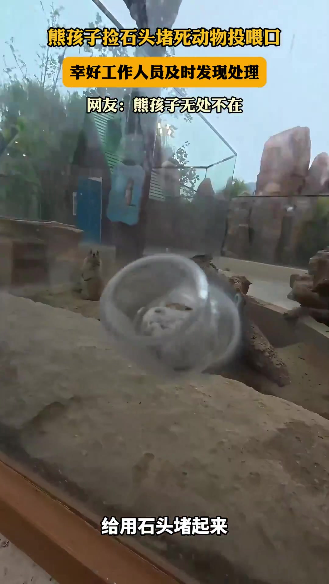 熊孩子捡石头堵死动物投喂口,幸好工作人员及时发现处理!