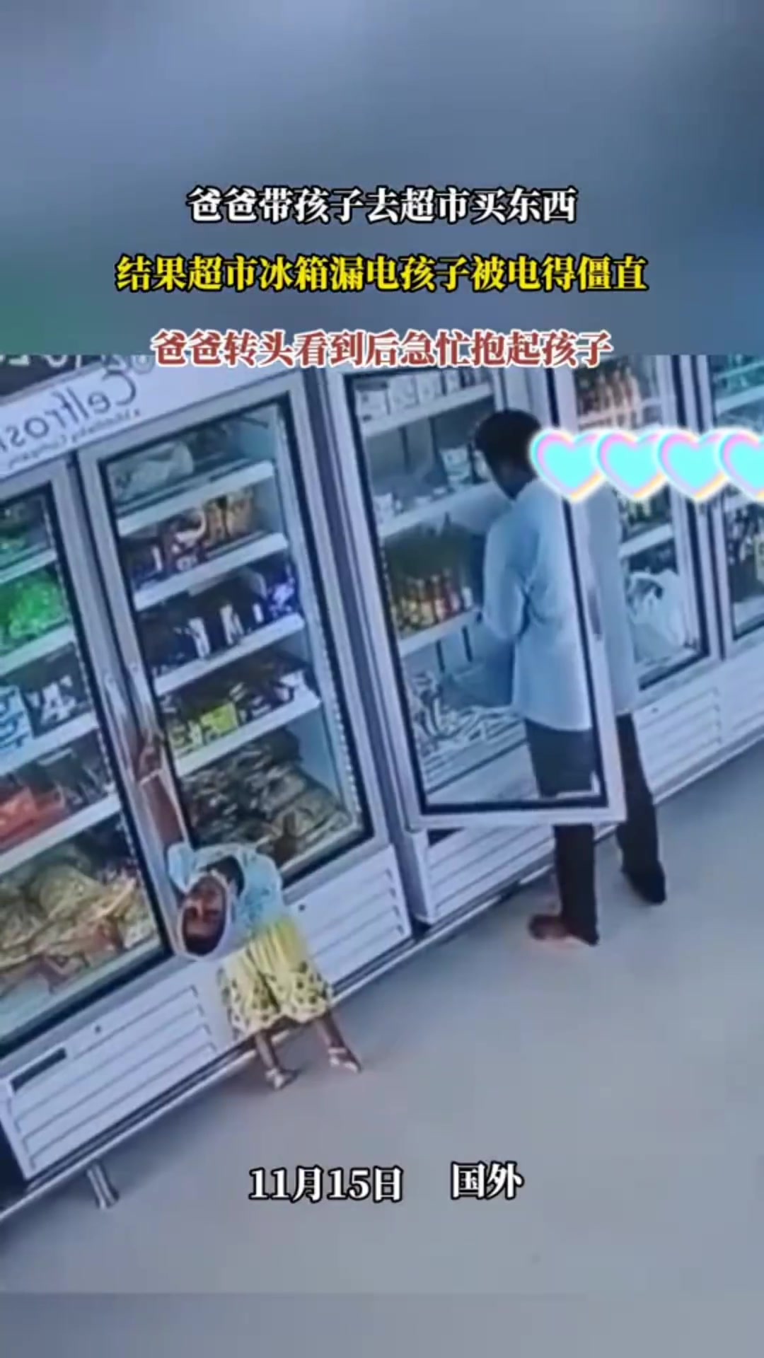 爸爸带孩子去超市买东西,结果超市冰箱漏电孩子被电得僵直!