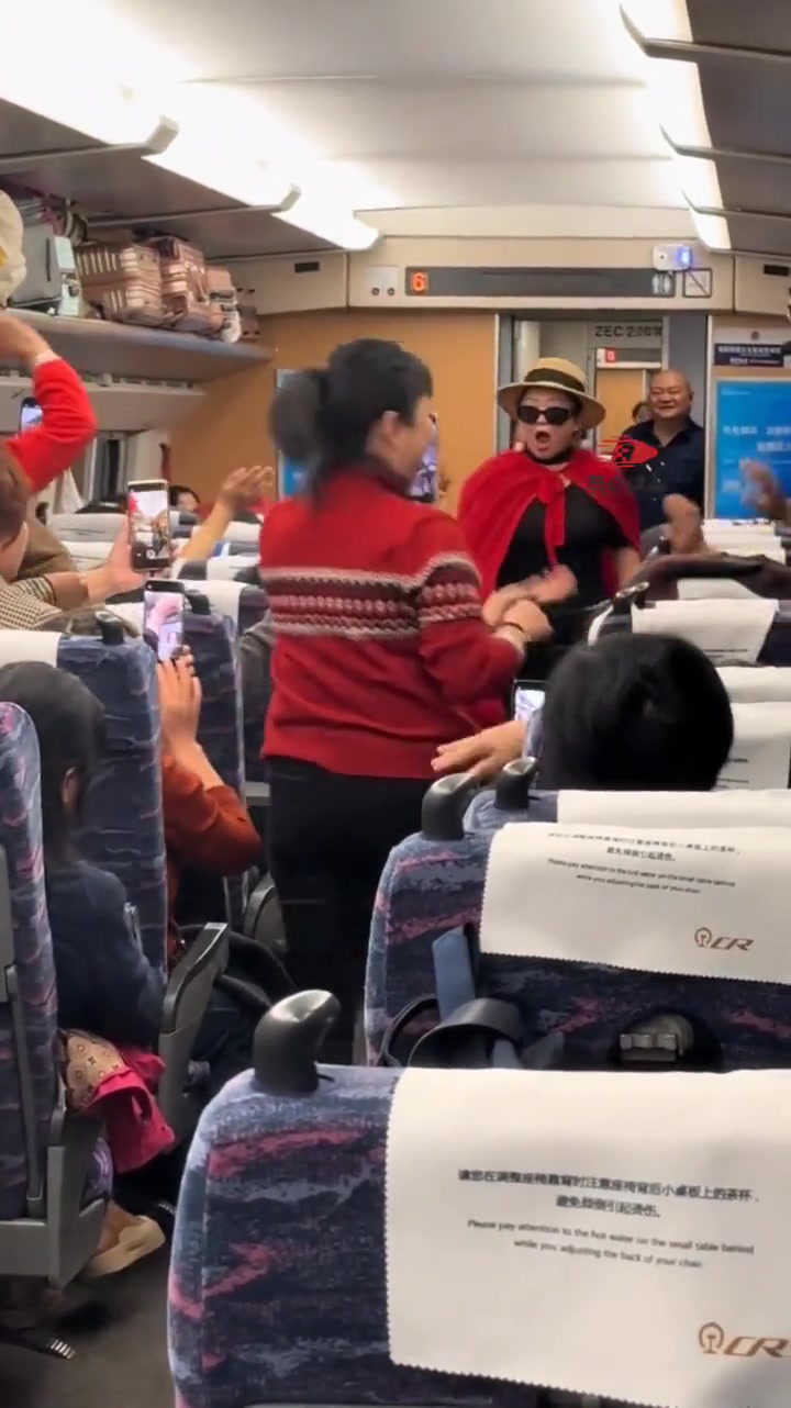 戴墨镜女子在高铁上走步喊口号录视频,多名同行者竟挥手助力!