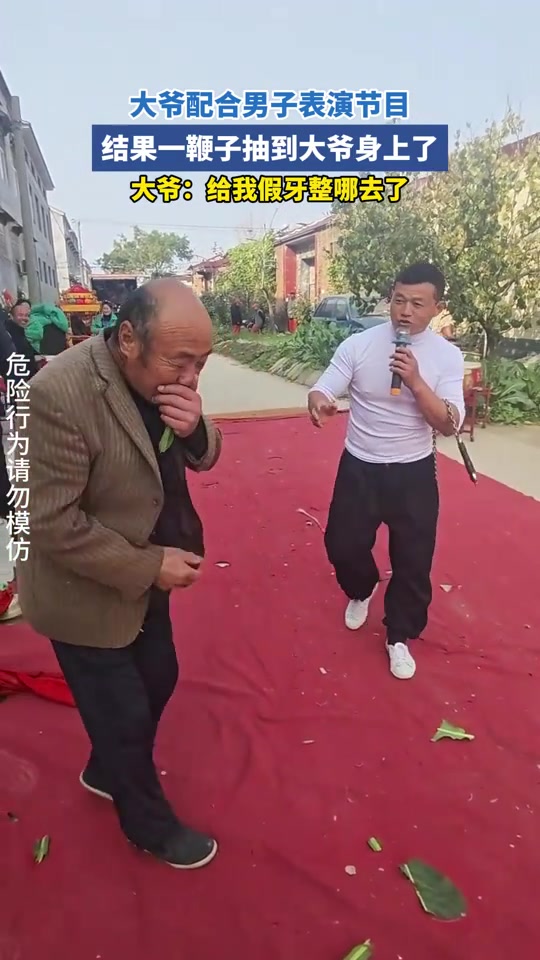 大爷配合男子表演节目,结果一鞭子抽到大爷身上了