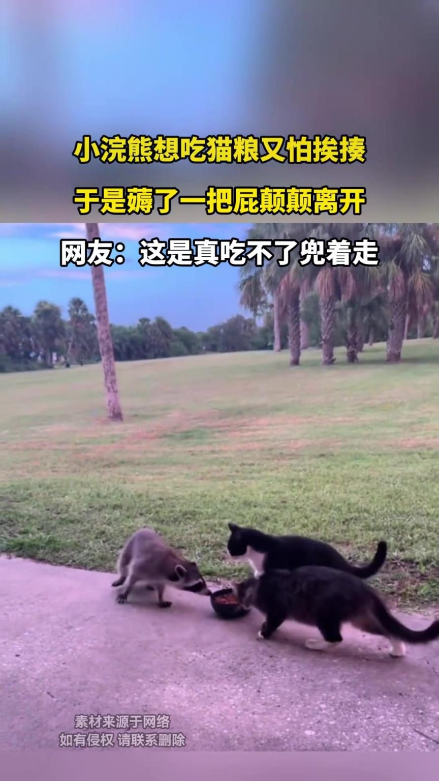 小浣熊想吃猫粮又怕挨揍,于是薅了一把屁颠颠离开