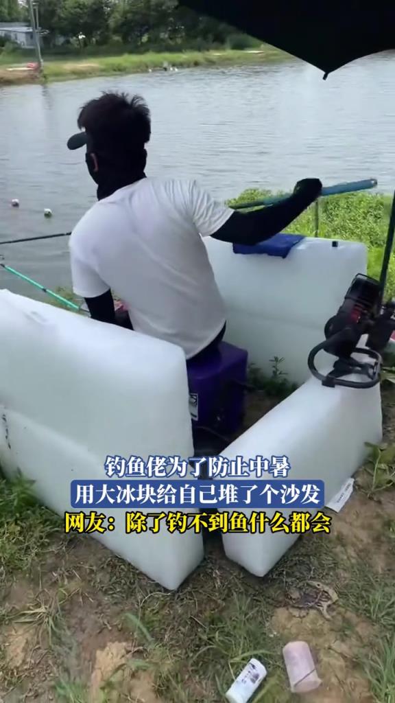 钓鱼佬为了防止中暑,用大冰块给自己堆了个沙发
