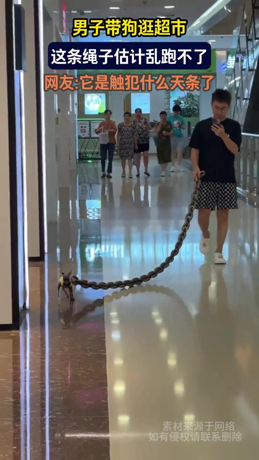 男子带狗逛超市,这条绳子估计乱跑不了