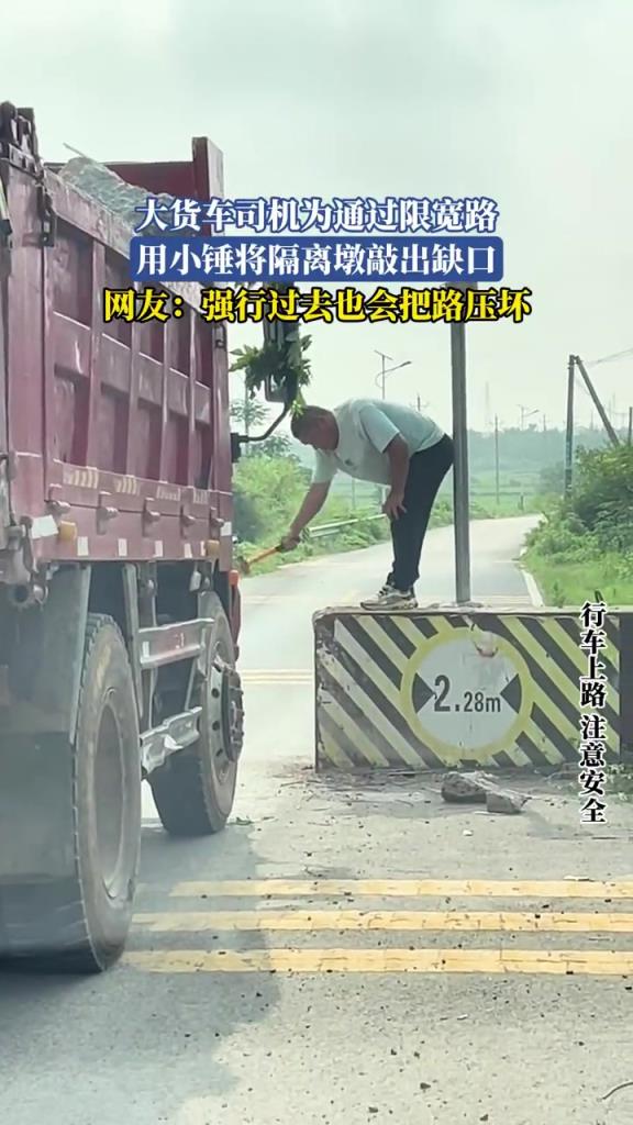 大货车司机为通过限宽路,用小锤将隔离墩敲出缺口