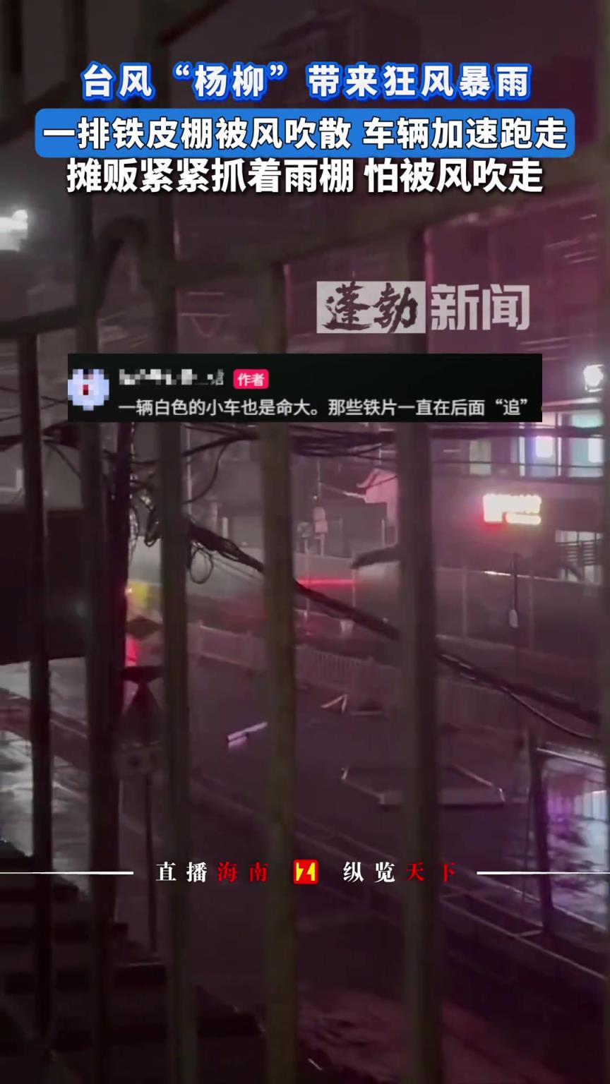 台风“杨柳”带来狂风暴雨,一排铁皮棚被风吹散,车辆加速跑走!