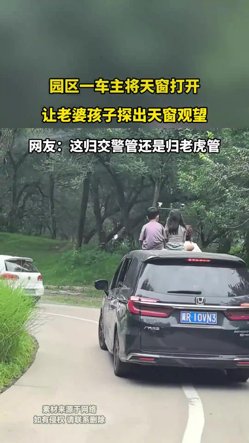 园区一车主将天窗打开,让老婆孩子探出天窗!