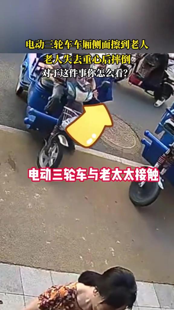 电动三轮车车厢侧面擦到老人,老人失去重心后摔倒!!