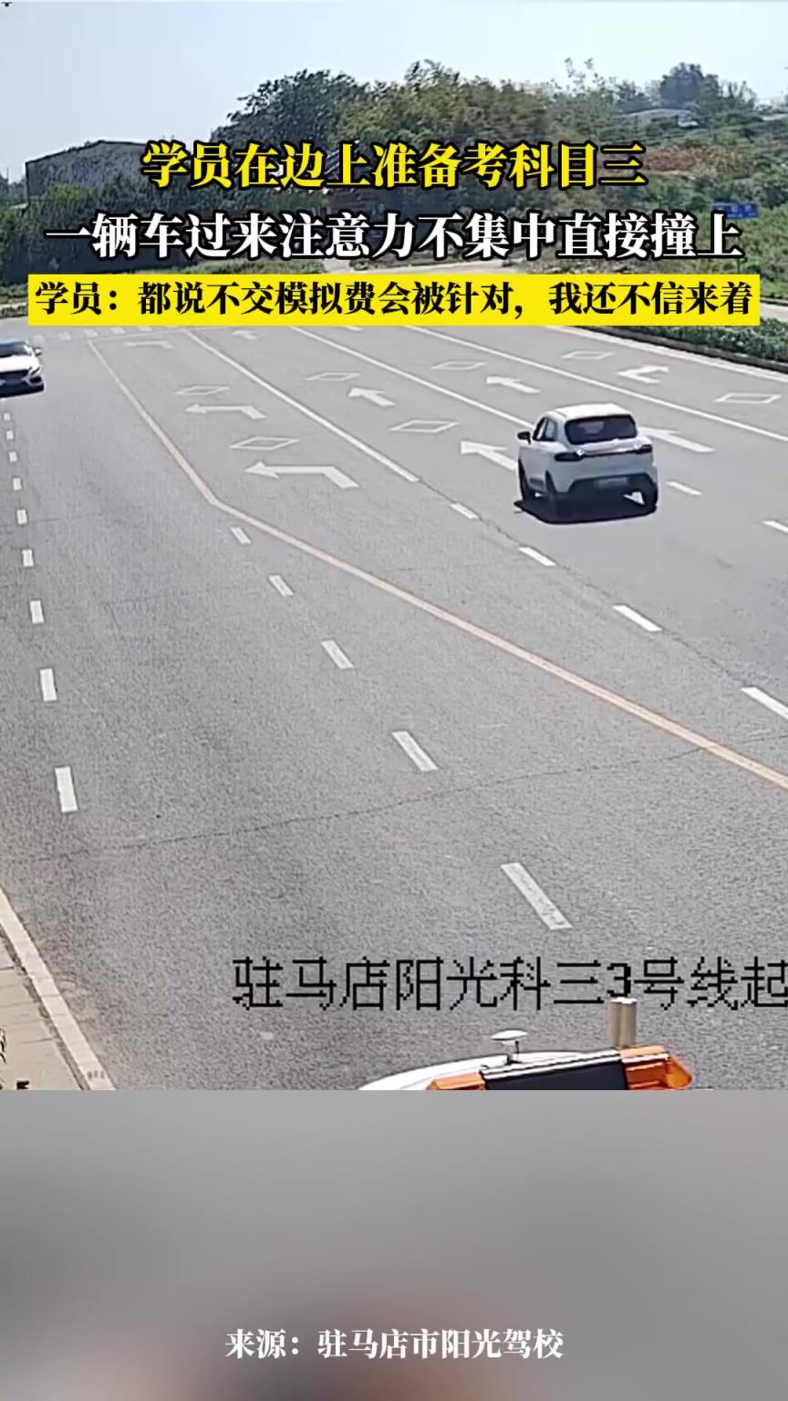 学员在边上准备考科目三,一辆车过来注意力不集中直接撞上